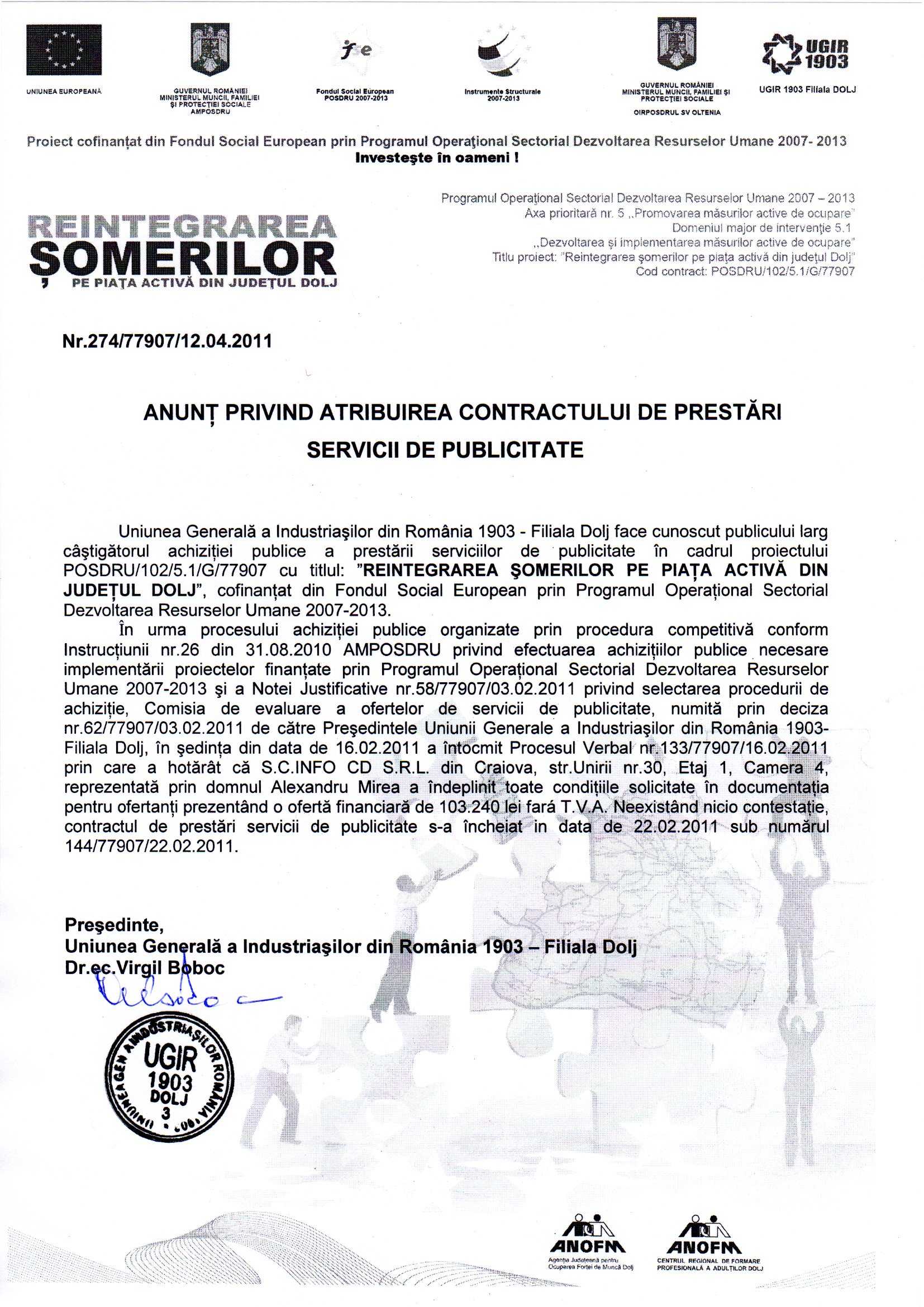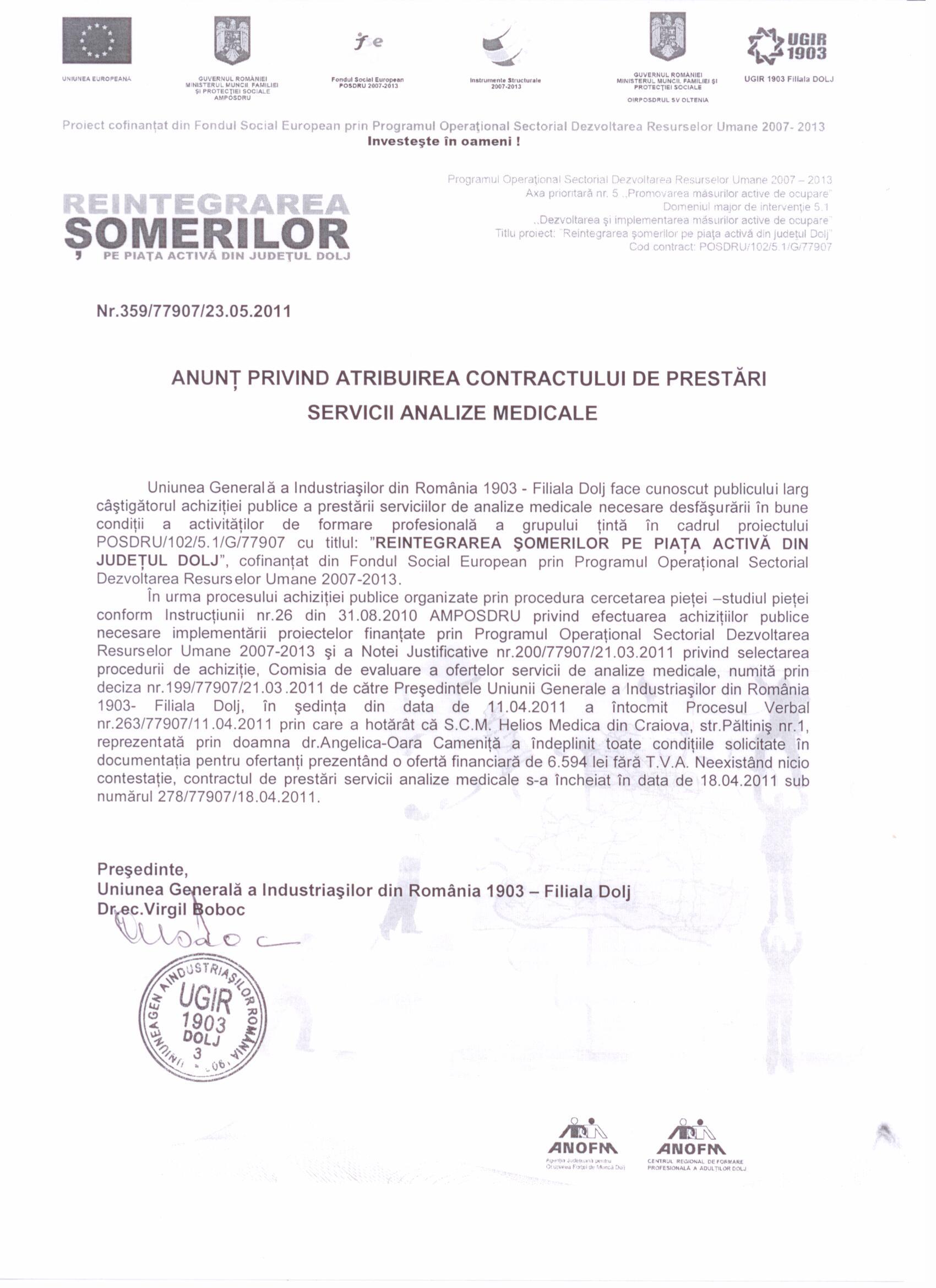 - Anunt atribuire contract Document publicat: 12.04.2011