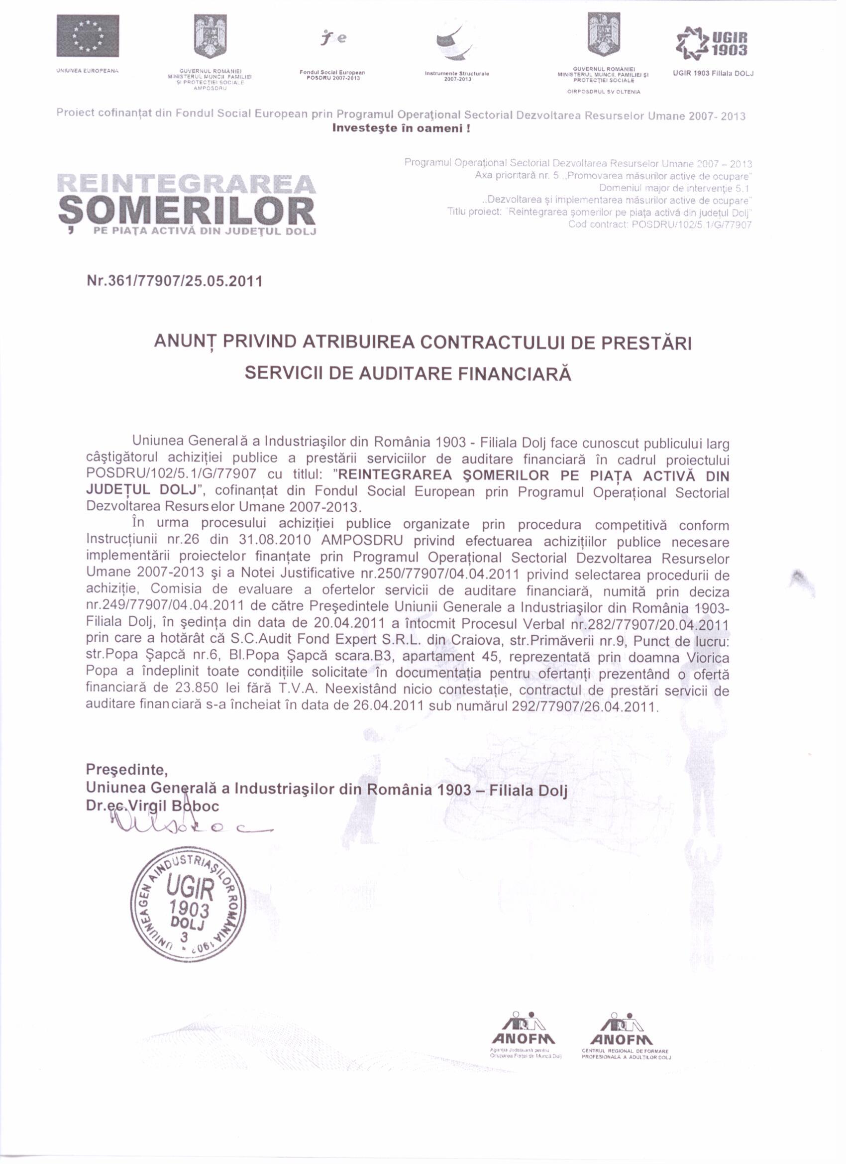- Anunt - Atribuire contract servcii de auditare financiara ( 25.05.2011 )