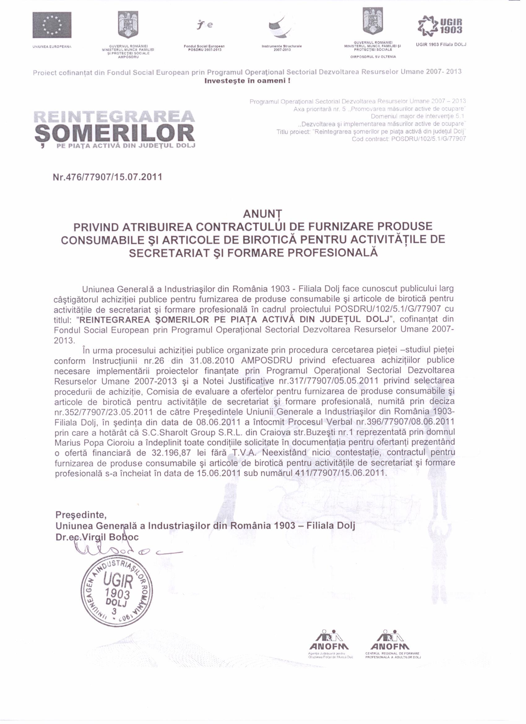 - Anunt - Atribuire contract furnuizare birotica Document publicat: 15.07.2011