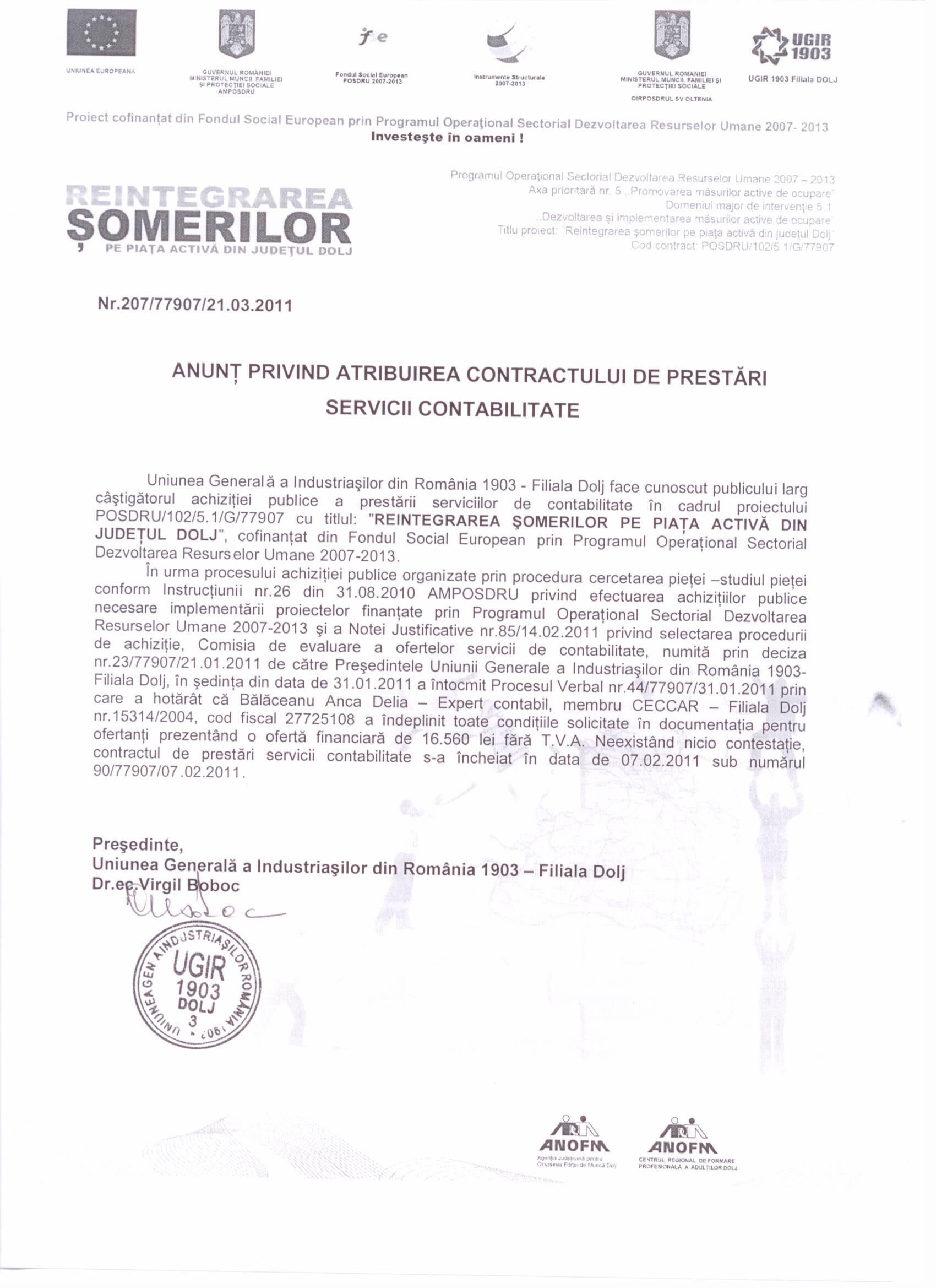- Anunt - Atribuire contract servcii de contabilitate Document publicat: 21.03.2011