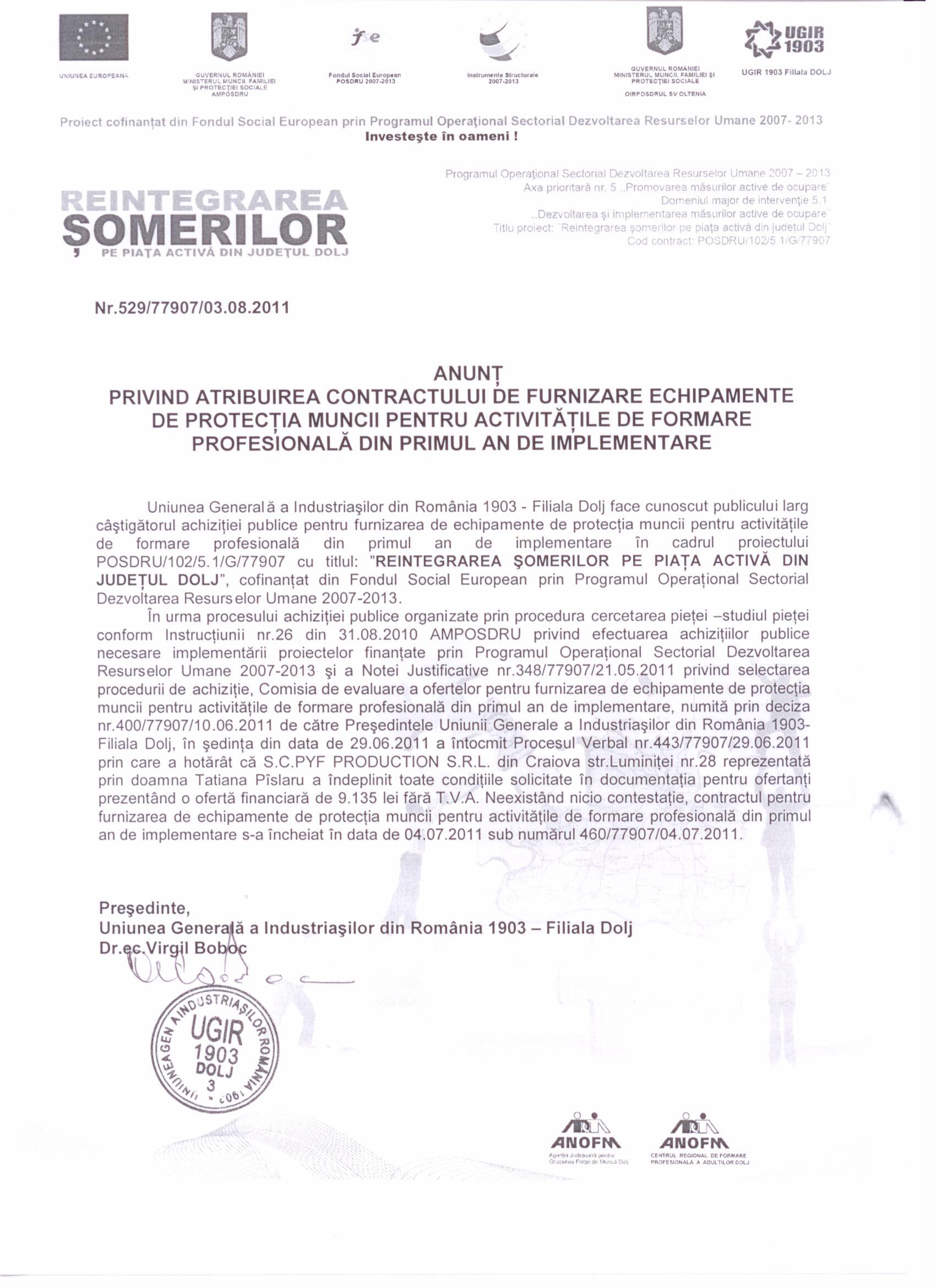 - Anunt - Atribuire contract furnizare echipament de protectia muncii Document publicat: 03.08.2011