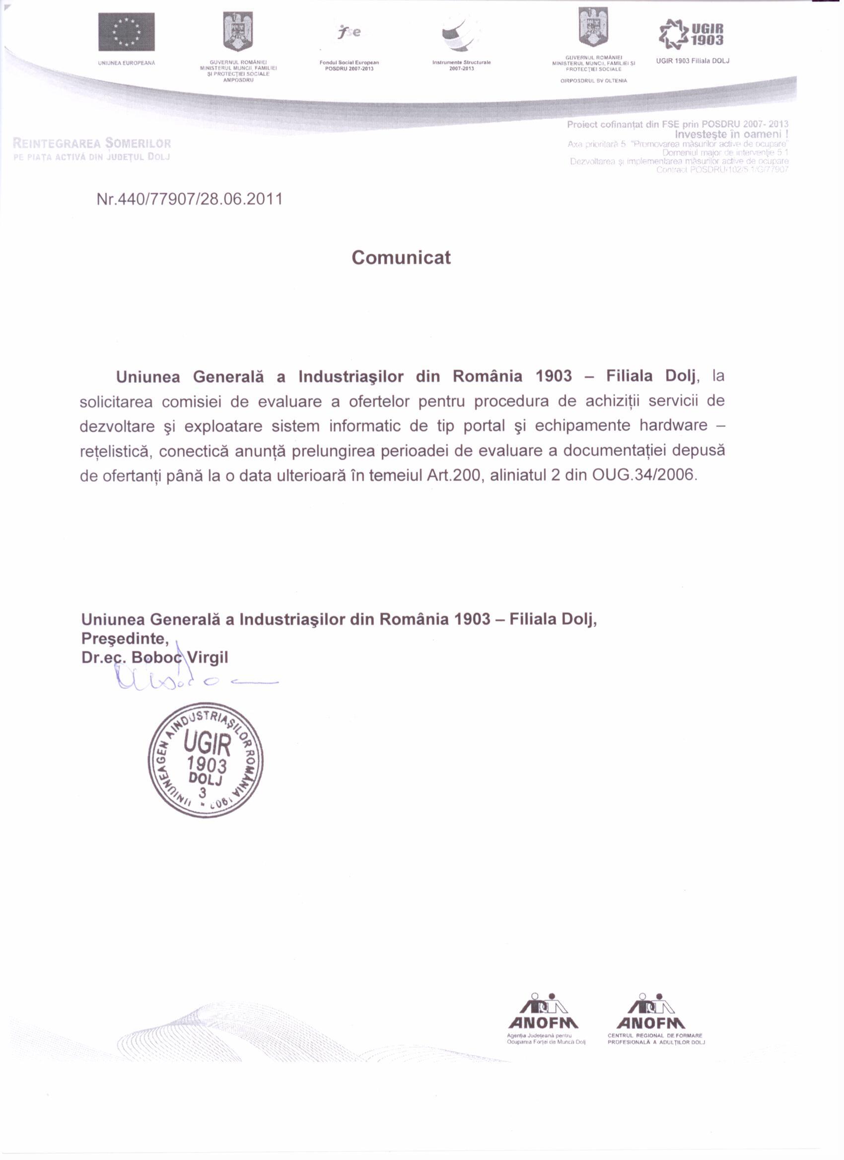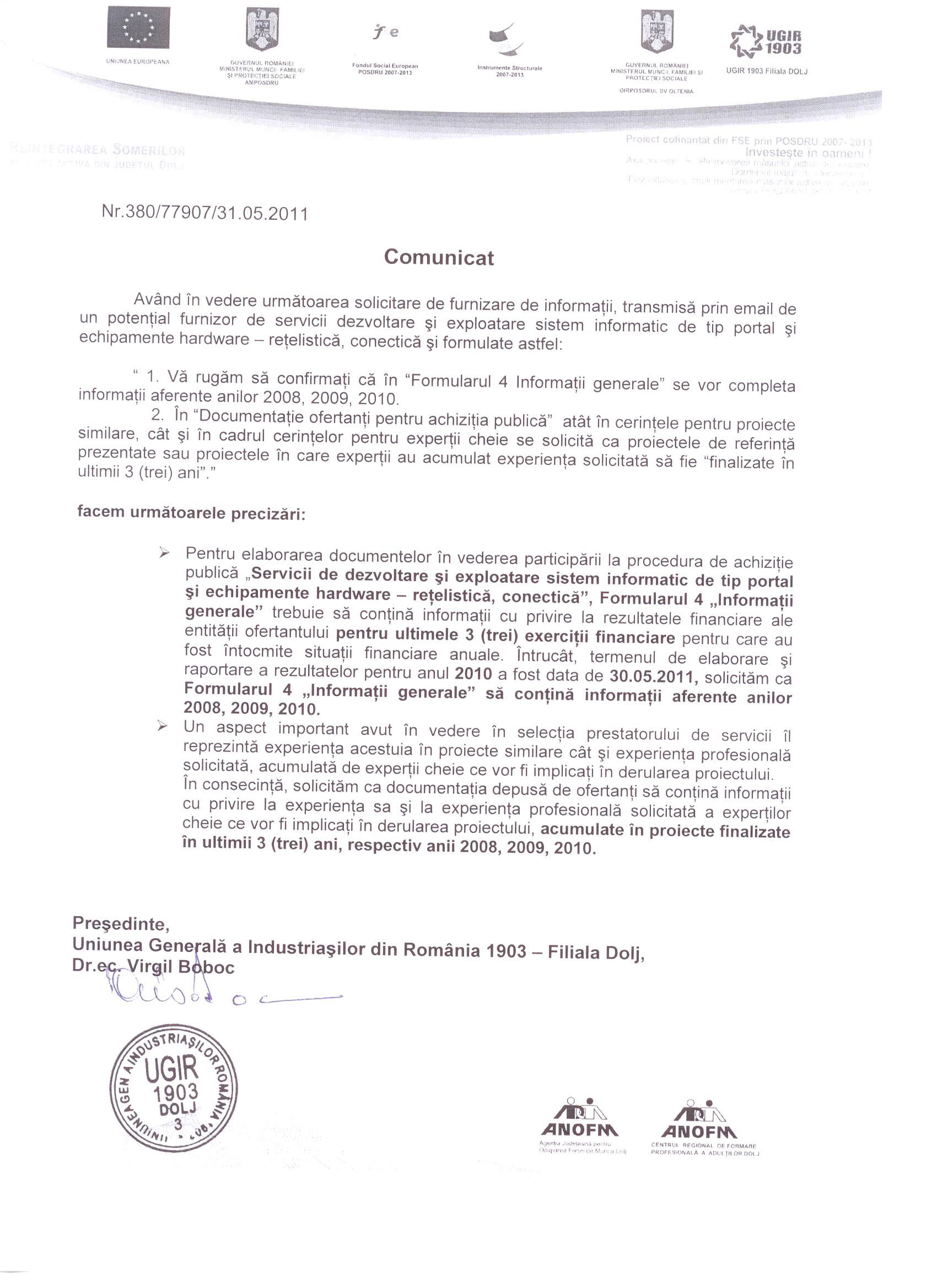 Comunicat - Solicitare clarificari Document publicat: 09.09.2011 ora 15:50