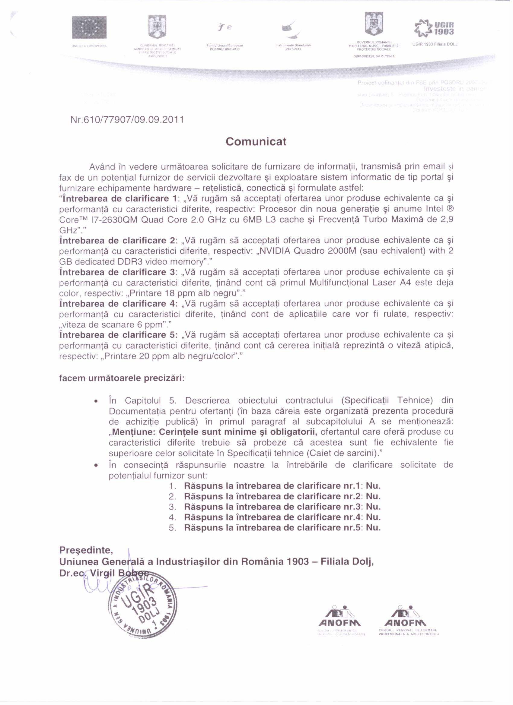 Comunicat - Solicitare clarificari Document publicat: 09.09.2011 ora 15:50
